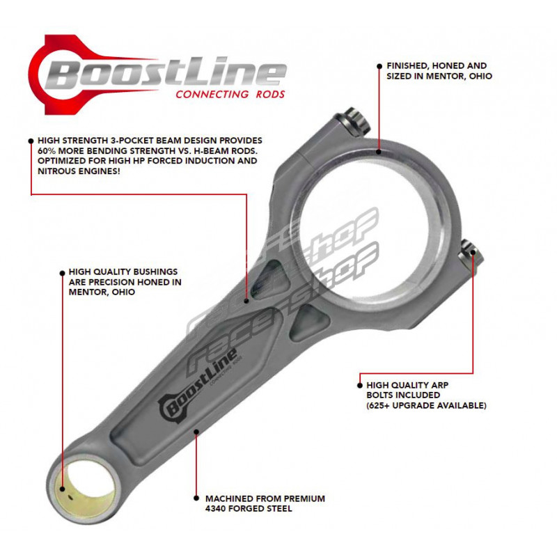Zaradi svoje zasnove so ojnice Boostline za 60 % odpornejše pri turbo, kompresorskih ali nitro aplikacijah kot običajne ojnice s H-nosilcem. Vsi izdelki so izdelani iz visokokakovostnega jekla 4340 in sestavljeni z vijaki ARP 2000. Povezovalne palice z nazivno močjo do 1000 KM za 4-valjnike, 1500 KM za 6-valjnike in 2000 KM za 8-valjnike.