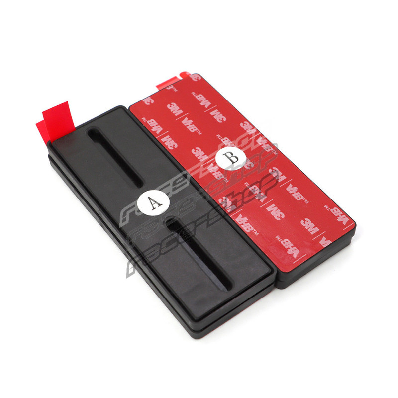 Vsak okvir je sestavljen iz dveh delov - del "A" je stran odbijača, pritrjena z vijaki, del "B" pa je stran registrske tablice, pritrjena s 3M VHB trakom. Močno magnetno povezavo med obema deloma omogočajo močni neodimijski magneti.