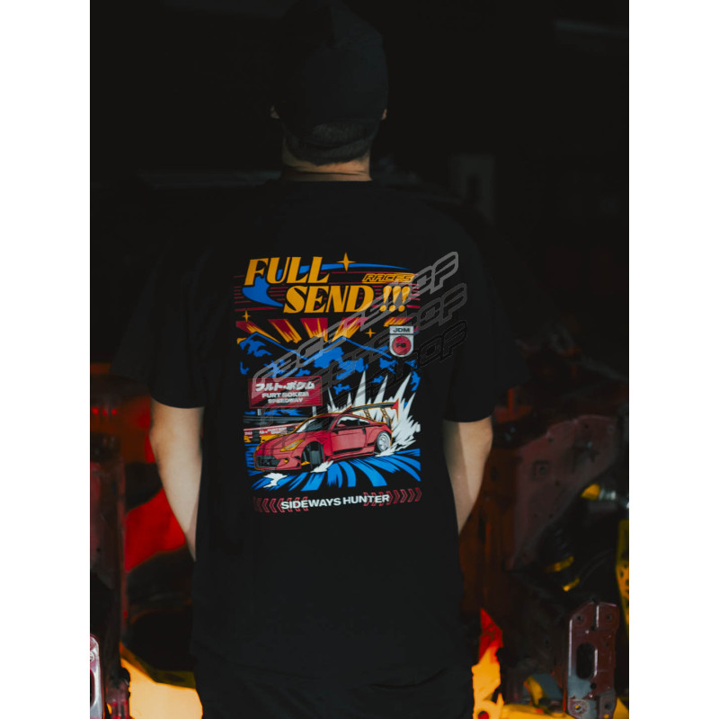 Vzali jsme fotku Luckyho 350z, poslali ji zahraničnímu grafikovi a ten ji překreslil do Japonských hor na Furt Bokem Speedway s naší oblíbenou hláškou FULL SEND! Tento design je v kolaboraci se závodní značkou Races by race-shop.
