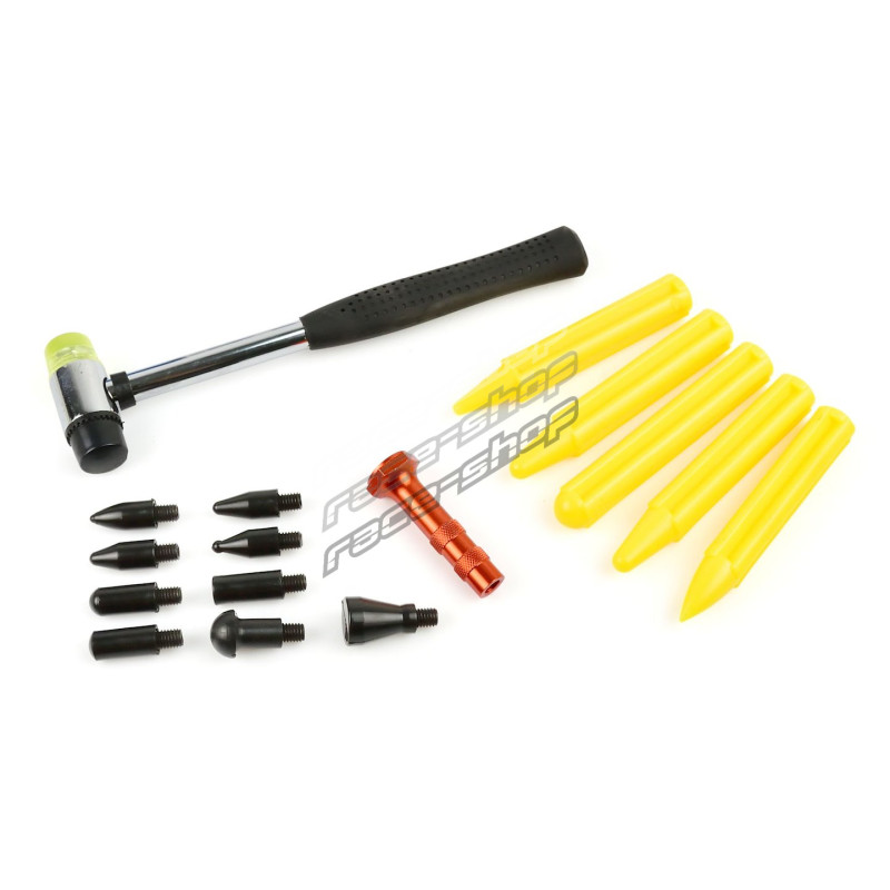 A set of tools for removing dents in the car body using the PDR method. Body hammer with a set of 5 nylon mallets and a mallet with 9 replaceable tips is perfect for removing small dents and leveling sheet metal surfaces. The mallets and replaceable tips are made of materials that do not scratch the car paint.