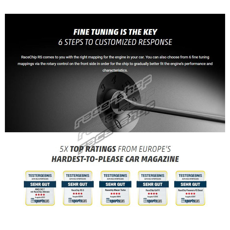 Since 1994 RaceChip® is an automotive software modification company with add-on units . These additional units are installed between the motor and the ECU. The function of this product is to receive and evaluate control unit signals (several thousand times per second), and then modify them to increase and optimize performance. Installation is very simple (within 10-15min.) and without loss of warranty for new vehicles. The company's products do not interfere with the basic system of the car, which keeps all the original functions active. RaceChip® is TÜV certified since 2009.