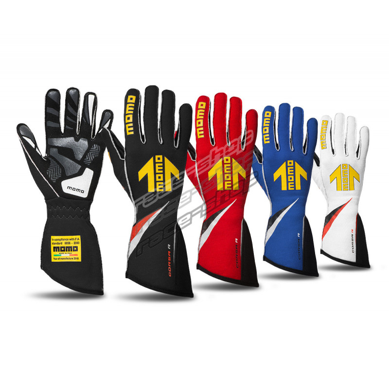 Anatomska konstrukcija s predhodno ukrivljeno konstrukcijo prstov preprečuje nabiranje tkanine za večje udobje. Enodelna rokavica s preciznim zunanjimi šivi, ki zagotavljajo trdno prileganje, brez neprijetnih pritiskov in odrgnin. Na voljo v različnih barvah: črni, beli, rdeči in modri. MOMO Corsa R rokavice odlično dopolnjujejo MOMO Race Suit ter ponujajo dodatno zaščito skladno s FIA standardom.