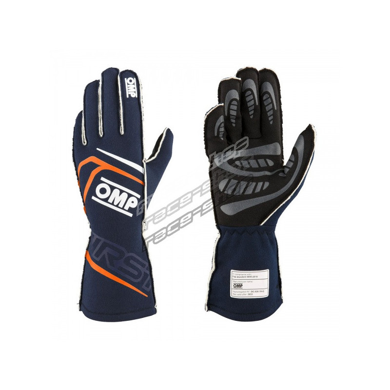Dirkalne rokavice OMP FIRST my2025 s FIA homologacijo in zunanjimi šivi,mornarsko modra/oranžna
